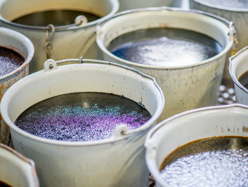 Nous pouvons créer des moquettes dans les couleurs les plus étonnantes, qui sont injectées dans le fil par 40 000 buses de pulvérisation. Derrière les buses, il y a un réseau complexe de tubes où les couleurs sont constamment remises en circulation pour empêcher les buses de se boucher et garantir que 86% de la teinture est réutilisée.