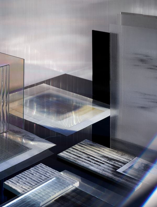 Une ombre est un instant, une image capturée qui disparait ; un voile changeant de couleur et de texture. Chacune est un mélange déroutant de nuances, l'une cédant doucement la place à l'autre. Vues à travers du verre texturé, les ombres sont déformées et créent des motifs chaotiques de lumière et d'obscurité.